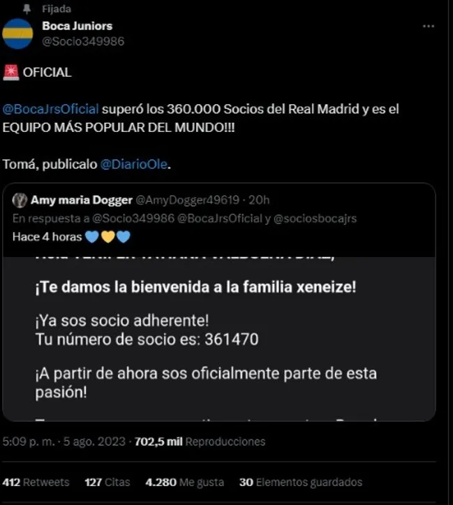 A partir de esto, un usuario xeneize a través de su cuenta de Twitter respondió que el era nada menos que el socio número 349.986 de Boca, tweet que posteriormente se volvió viral y le dio la razón a todos los fanáticos del conjunto de la Ribera.