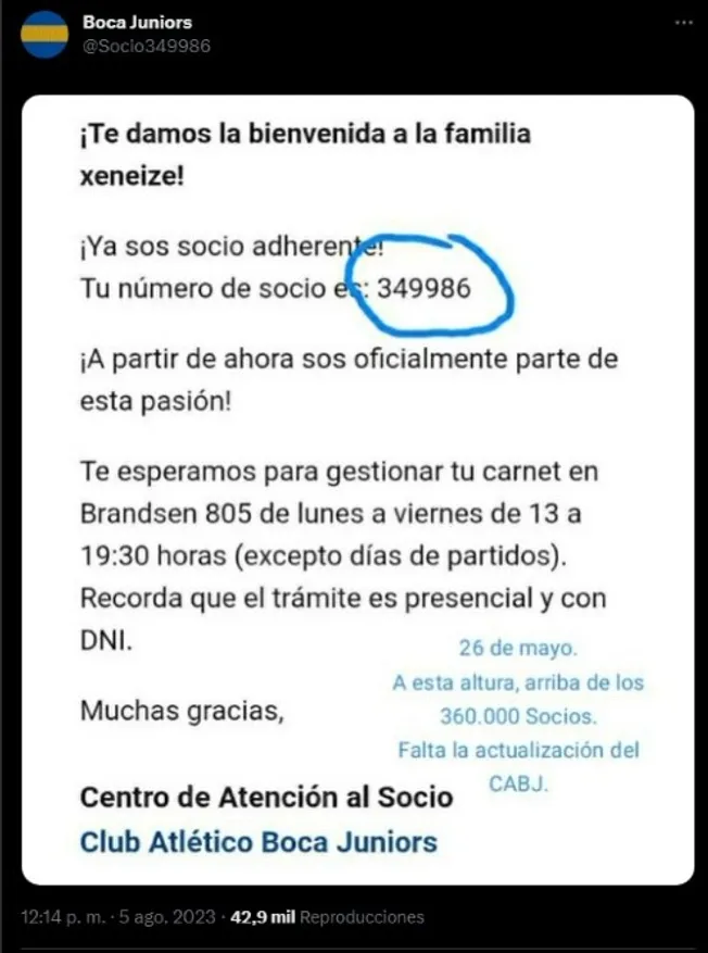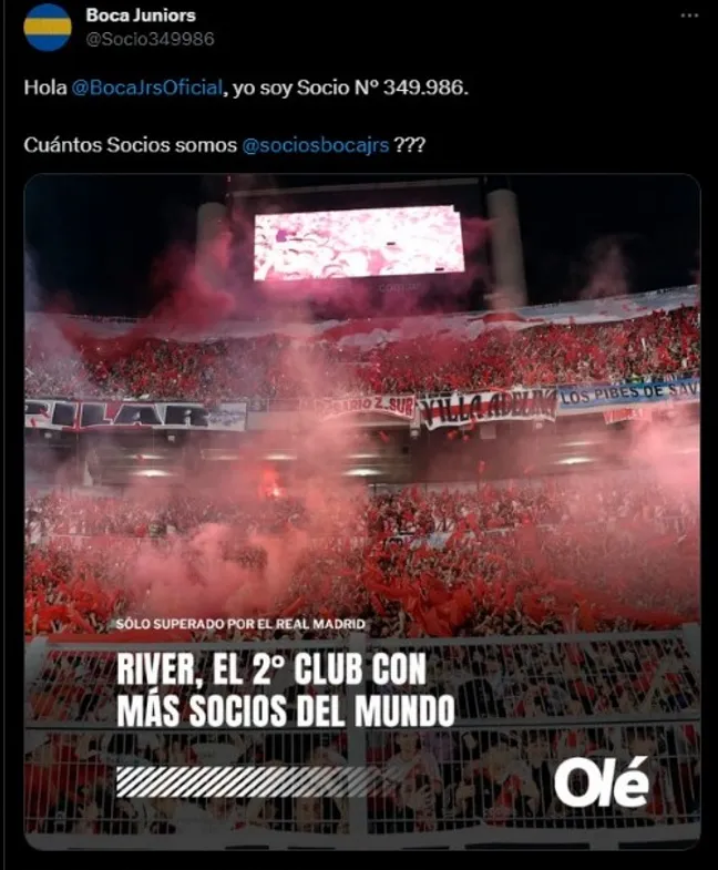 Consecuentemente, el usuario @Socio349986 subió una captura de su confirmación como nuevo socio de Boca en donde figuraba en la página web que este efectivamente era el miembro número 349.986, situación que culminó una vez más con el debate de quien tiene más asociados.