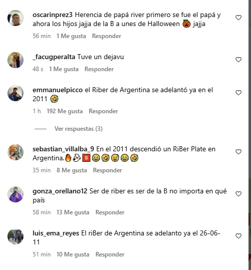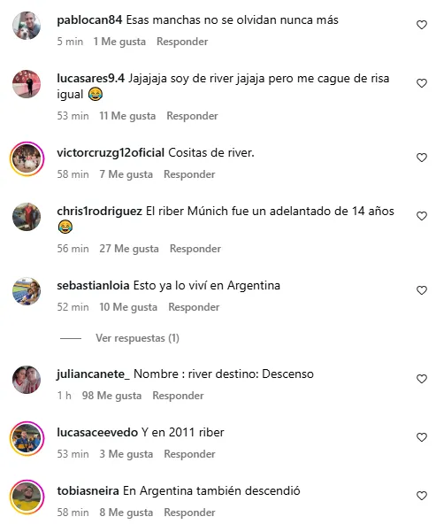 “Nombre: River. Destino: Descenso“, “Cositas de River“, “En Argentina también descendió“, “Esas manchas no se olvidan nunca más“, fueron los comentarios de algunos fanáticos en Instagram sobre lo sucedido con los clubes homónimos al de Núñez.