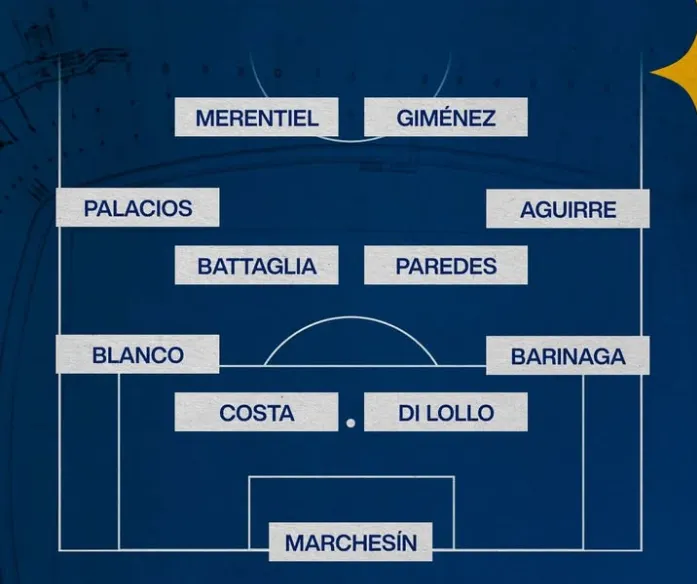 El 11 será: Agustín Marchesín; Juan Barinaga, Lautaro Di Lollo, Ayrton Costa, Lautaro Blanco; Brian Aguirre, Leandro Paredes, Rodrigo Battaglia, Carlos Palacios; Miguel Merentiel, Milton Giménez.