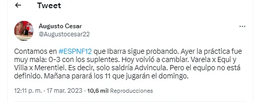 Es que en la jornada vespertina del jueves, paró un equipo titular sin Luis Advíncula, Alan Varela ni Sebastián Villa en el once inicial. Aunque, según reveló el periodista Augusto César, el once no encontró el funcionamiento esperado y el cuerpo técnico daría marcha atrás en su decisión.