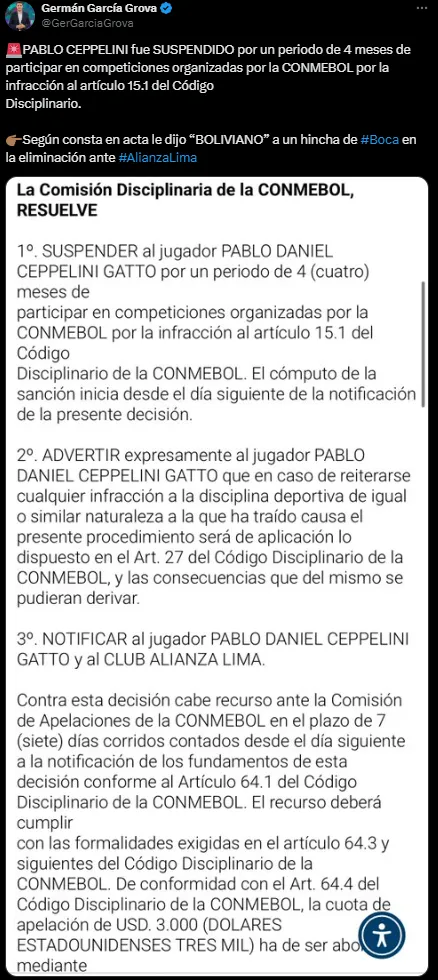A más de un mes de que se consumara la eliminación, la CONMEBOL sancionó a uno de los jugadores del equipo peruano. Se trata de Pablo Ceppelini, quien convirtió el gol del triunfo para los de Pipo Gorosito en el partido de ida.