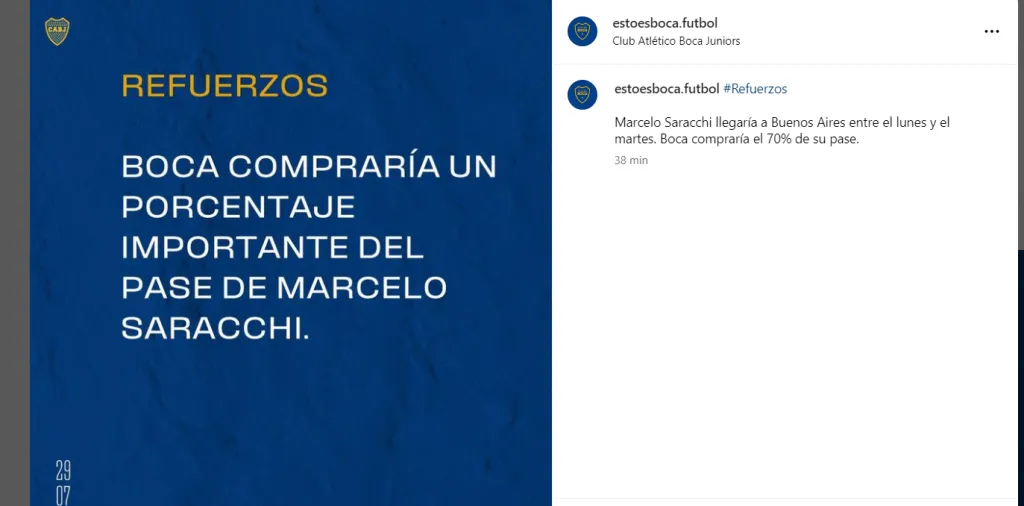 El Xeneize comprará el lateral. Así lo informó la nueva cuenta de Boca: “Marcelo Saracchi llegaría a Buenos Aires entre el lunes y el martes. Boca compraría el 70% de su pase”. Según contó el periodista Germán García Grova, firmará por tres años y medio.