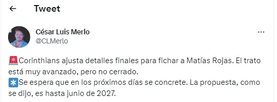 Aunque, según informó el periodista César Luis Merlo, el futuro del 10 podría estar en el fútbol de Brasil. Precisamente en el Corinthians. Club que “aujsta detalles finales para fichar a Matías Rojas. El trato está avanzado, pero no cerrado”, informó el cronista. ¿Fin del sueño?