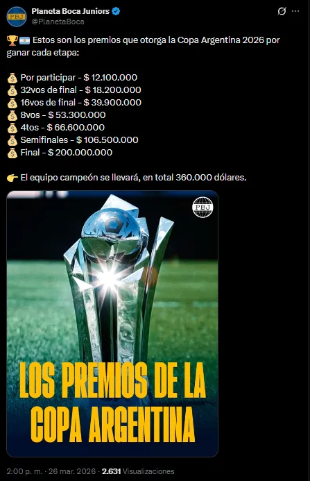 La Copa Argentina es uno de los torneos que juega Boca en este 2026, por el solo hecho de formar parte de la máxima categoría del fútbol argentino. Si bien está por detrás en importancia con respecto a la Copa Libertadores y el campeonato de Primera, puede volverse clave para clasificar a un torneo internacional.