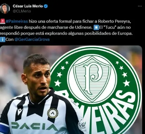 A partir de lo mencionado, la información del interés de Palmeiras fue propiciada por César Luis Merlo quien confirma que el conjunto semifinalista hizo una oferta formal para fichar al atacante de 32 años. No obstante, el jugador aún no respondió ya que espera también oportunidades en Europa.