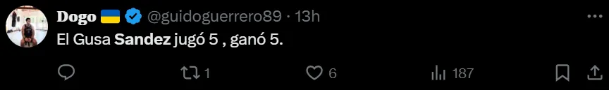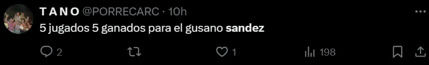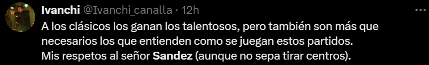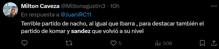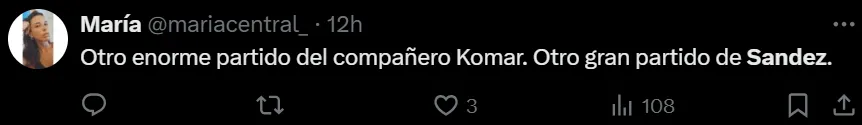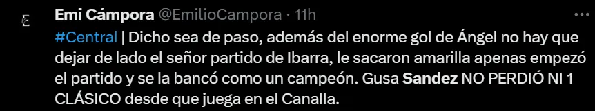 “Otro gran partido del compañero Komar. Otro gran partido de Sández”, “5 jugados, 5 ganados para el ‘Gusano’ Sández”, “Estos partidos los ganan los talentosos, pero también los que entienden cómo se juegan, mis respetos al señor Sández”, fueron algunos de los comentarios elogiando el nivel y lo infalible que viene siendo Agustín ante Newell’s.