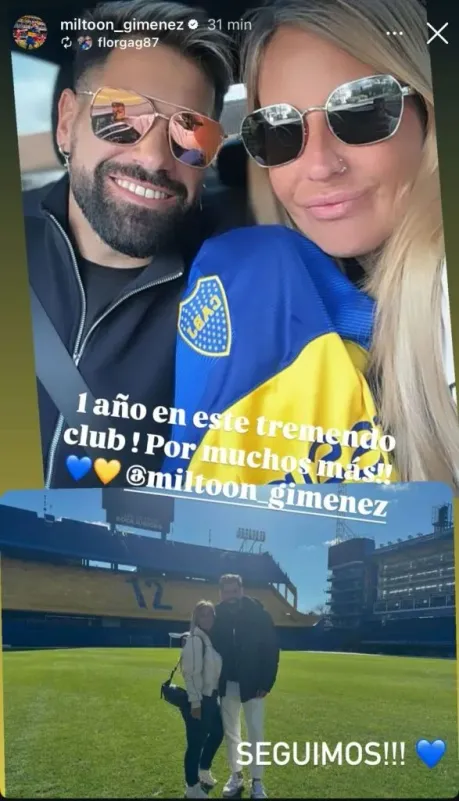 Mientras crecen las incógnitas sobre el futuro de Giménez, su esposa compartió una ‘storie’ en su cuenta de Instagram y con dos fotos junto a Milton. “1 año en este tremendo club! Por muchos más!”, escribió en este posteo, a lo que el delantero reposteó con un claro mensaje: “Seguimos!!!”. Entre charlas, rumores y una posible oferta, el delantero fue claro: quiere seguir vistiendo la camiseta azul y oro.