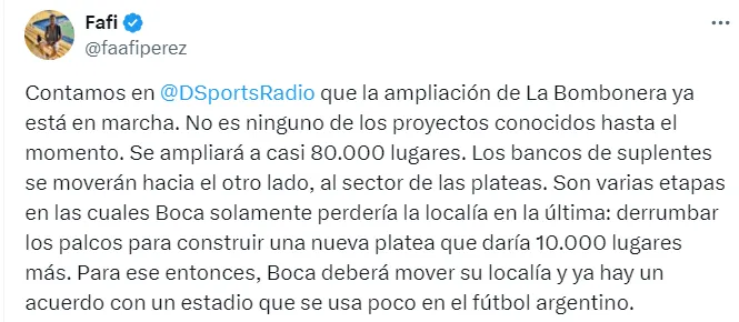 La información que brindó el periodista Facundo Pérez indica que “la ampliación de La Bombonera está en marcha” y que “la capacidad de la cancha llegaría a casi 80 mil lugares”.