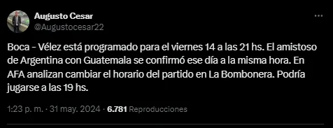 En principio, el encuentro estaba pautado para las 21 pero un evento podría cambiar todo. La Selección Argentina juega el mismo día frente a Guatemala un amistoso en Estados Unidos previo al torneo continental. Esto haría que el encuentro del Xeneize pueda cambiar el horario de su encuentro y se juegue a las 19.