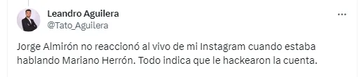 En simultáneo, el periodista Leandro Aguilera también recibió la comunicación del entrenador: “Jorge Almirón no reaccionó al vivo de mi Instagram cuando estaba hablando Mariano Herrón”. Y reveló cuál fue la explicación que salió del circulo del ex director técnico del club: “Todo indica que le hackearon la cuenta”.
