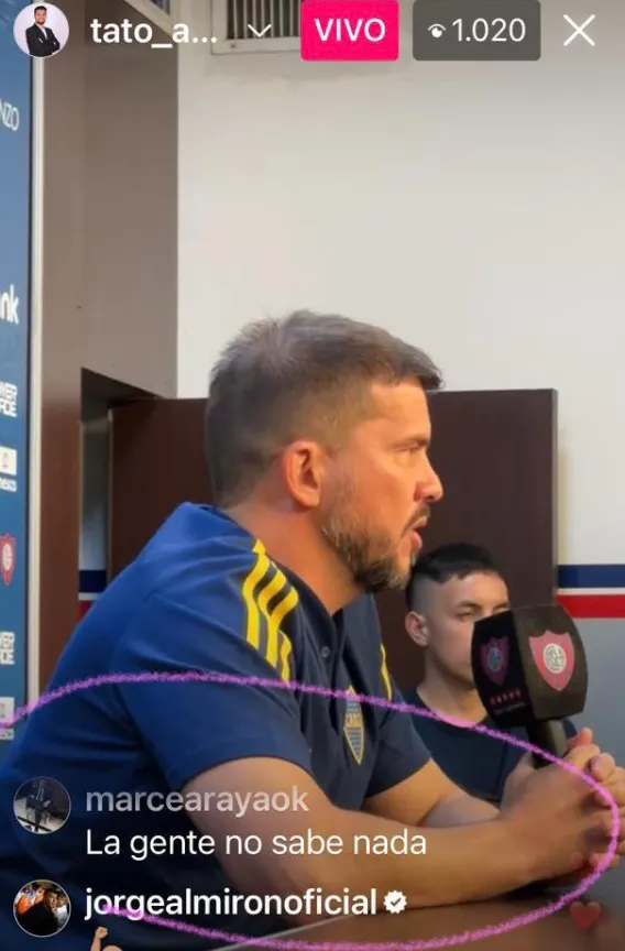 El periodista de TyC Sports, Leandro Aguilera, estaba transmitiendo en vivo las palabras del entrenador interino. Cuando, dentro de los muchos comentarios que figuraban, apareció una reacción con un emoji de un brazo haciendo fuerza. La cuenta verificabada era la de “jorgealmironoficial“. Sin embargo, el DT negó haber hecho esa interacción.