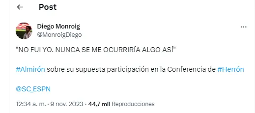 El ex entrenador de Boca le mandó un mensaje al periodista Diego Monroig y desmintió haber hecho ese comentario en el vivo. “No fui yo, nunca se me ocurriría algo así”, contó el cronista de ESPN. Almirón, enterado de la viralización de la interacción, intentó aclarar la situación lo antes posible.