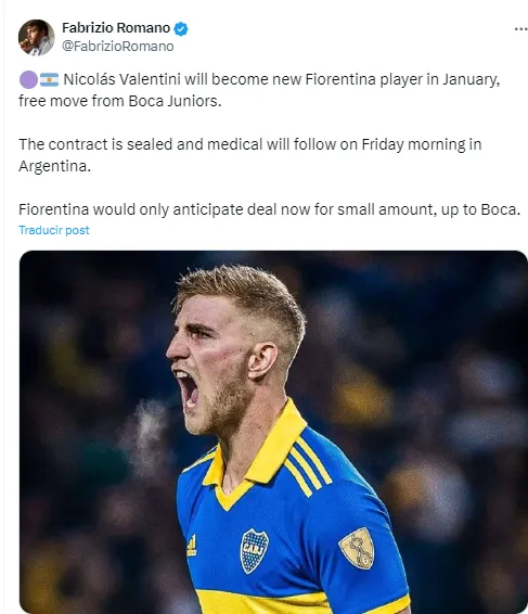 Ahora, con el destino de Valentini confirmado en la Fiorentina de Italia, solo queda definir cuándo se va: si en enero luego de estar seis meses enteros sin tener roce en competencias oficiales. O si los italianos acercan un ofrecimiento formal a Boca para llevarselo ahora.