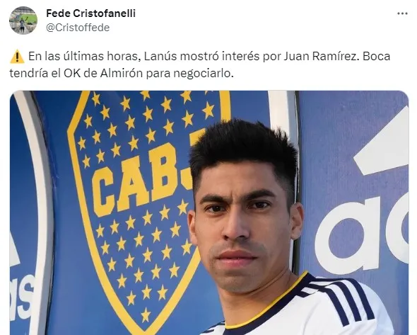 El periodista Federico Cristofanelli brindó más detalles al respecto e informó que “en las últimas horas, Lanús mostró interés por Juan Ramírez”. Además, indicó que “Boca tendría el ‘ok’ de Almirón para negociarlo”. Tras 87 encuentros disputados en el Xeneize, el Granate podría sumar una nueva incorporación en esta ventana de transferencias.