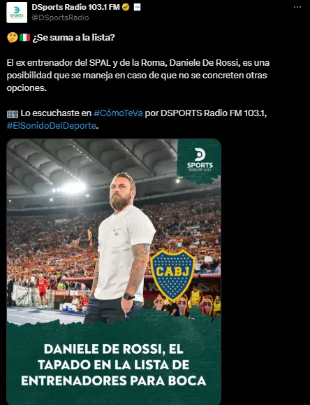 Si bien Gabriel Milito suena como el principal apuntado para llegar al Xeneize, en las últimas horas apareció el nombre de un campeón del mundo y exjugador del club. Daniele De Rossi es una de las posibilidades que se maneja para el banco del equipo de la Ribera, según reveló el periodista Marcelo Benedetto de DSports Radio.
