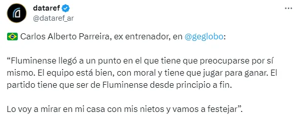 En diálogo con Ge Globo, Parreira comenzó aclarando que va a “festejar” la victoria del conjunto Tricolor. “Lo voy a mirar en mi casa con mis nietos y vamos a festejar“. Cabe destacar que el hombre de 80 años se siente identificado con el conjunto Carioca, al cual comandó en 4 etapas diferentes de su carrera como técnico.