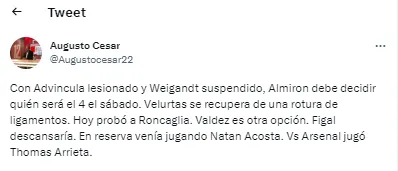 Hay una posición quegenera incógnita total. Y es la de lateral derecho. Es que Marcelo Weigandt, quien parece ser el nuevo dueño del sector, debe cumplir con una fecha de suspensión tras la expulsión ante Arsenal. Pero tampoco podrá estar Luis Advíncula, quien tendría una distención del ligamento de su rodilla.