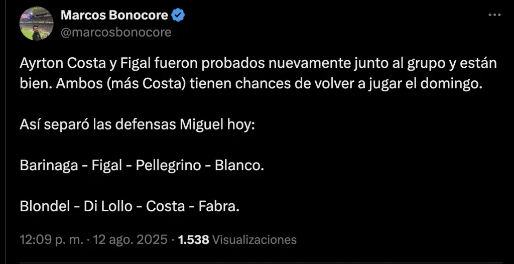 De esta manera, la primera defensa que probó “Miguelo” estuvo compuesta por la que en la previa parecería ser la titular con Juan Barinaga, Nicolás Figal, Maro Pellegrino y Lautaro Blanco. Mientras que la otra defensa estuvo compuesta por Lucas Blondel, Lautaro Di Lollo, Ayrton Costa y Fabra.
