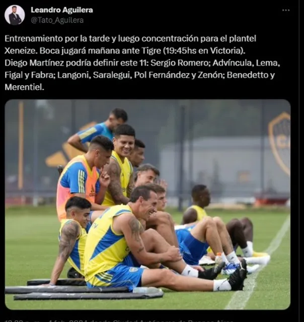 Según pudo contar Tato Aguilera en su cuenta de Twitter, esta sería la probable formación de Boca para enfrentar a Tigre como visitante: Sergio Romero; Luis Advíncula, Cristian Lema, Nicolás Figal y Fabra; Luca, Langoni, Jabes Saralegui, Pol Fernández y Kevin Zenón; Darío Benedetto y Miguel Merentiel.