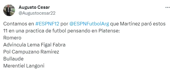 En el entrenamiento matutino de este jueves, Martínez formó con Sergio Romero; Luis Advíncula, Nicolás Figal, Cristian Lema, Frank Fabra; Guillermo Fernández, Jorman Campuzano, Juan Ramírez; Ezequiel Bullaude; Luca Langoni y Miguel Merentiel.