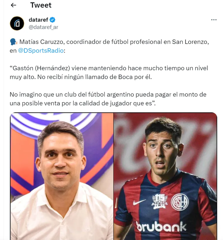 Ahora, quien desmintió la posibilidad fue el Manager de San Lorenzo, Matías Caruzzo. El exdefensor de Boca y ahora dirigente del Ciclón fue muy sincero al ser consultado al respecto en su charla con DIRECTV Sports Radio.