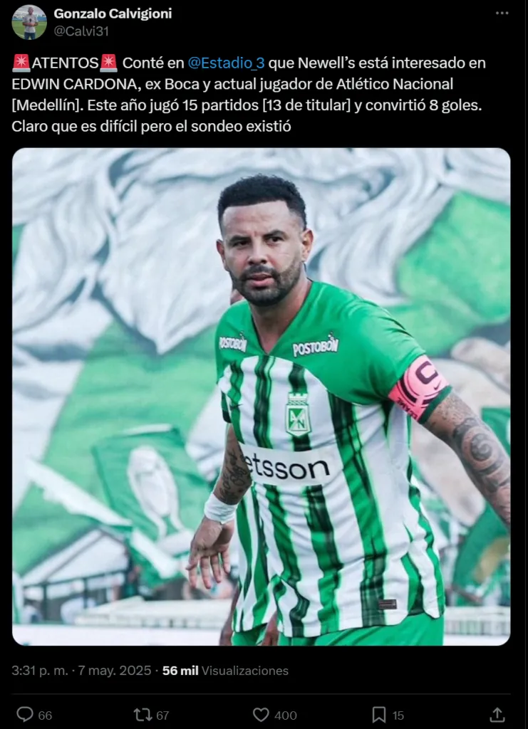 El periodista rosarino Gonzalo Calvigioni, contó en Cadena 3 de Rosario, que Newell’s tiene en carpeta al mediocampista de 32 años. La fuente citada señaló que es complicada su salida del equipo de Medellín, pero de todas formas hubo un sondeo para conocer su situación. Desde Colombia, aseguran que todavía no llegó ninguna oferta formal por el jugador.