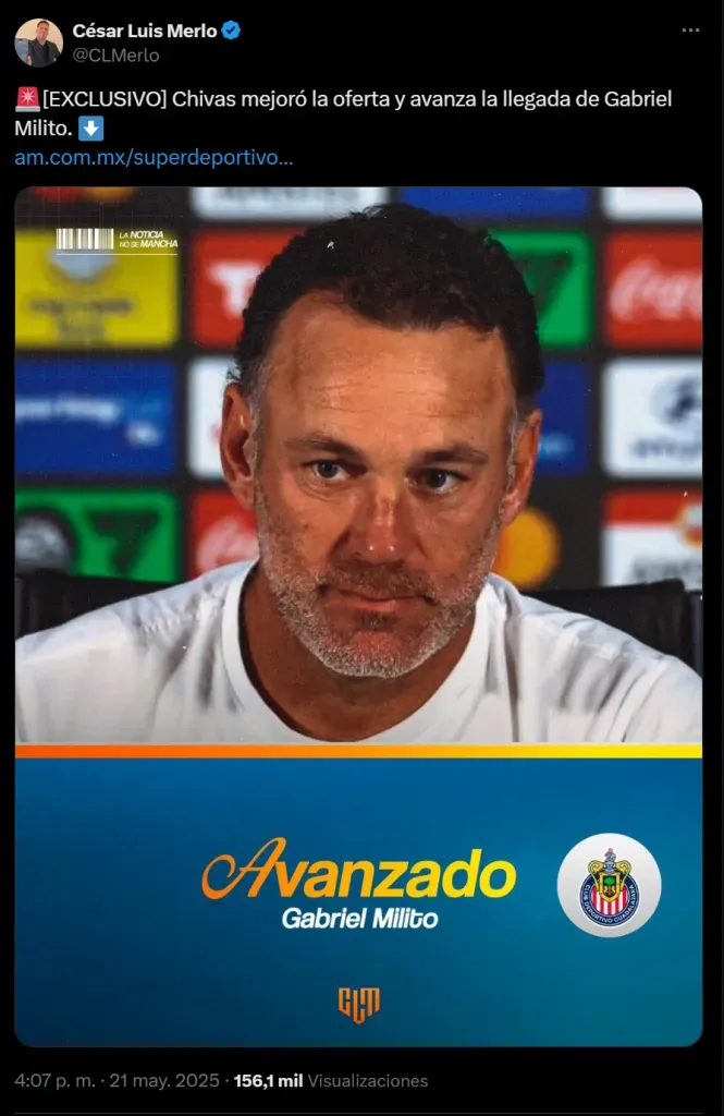 Al mismo tiempo que se conoció el interés de Boca por Milito, también se supo de que no era el único equipo que tenía en carpeta al ex DT de Atlético Mineiro. En un principio, Rayados de Monterrey había tenido una reunión con él. Sin embargo, Chivas de Guadalajara fue quien avanzó mucho más, ofreciéndole el cargo formalmente.