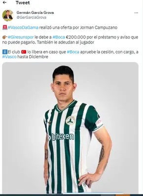 De manera inesperada, Boca podría ubicar a uno de los futbolistas extranjeros que pertenecen a la institución en el fútbol brasileño. Aunque se trataría de uno de los futbolistas que no está actualmente en el Xeneize: Jorman Campuzano está en los planes del Vasco Da Gama.