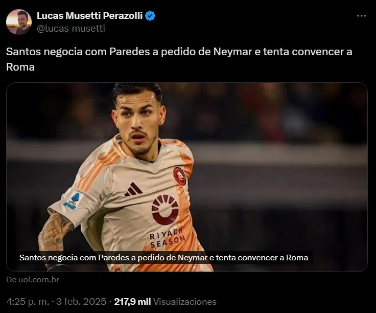 Hace algunas semanas se supo que Neymar pidió a Paredes en el Santos y que el volante argentino rechazó esa propuesta, como también descartó ir al fútbol de Arabia. Su plan era quedarse en la Roma de Italia o volver a vivir a Argentina y cumplir el sueño de tener una segunda etapa en Boca.