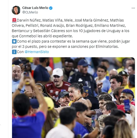 Fue el periodista César Luis Merlo quien informó que CONMEBOL le abrió un expediente a Darwin Núñez, Matías Viña, Mele, José María Giménez, Mathías Olivera, Pellistri, Ronald Araújo, Brian Rodríguez, Emiliano Martínez, Rodrigo Bentancur y Sebastián Cáceres por los disturbios en Uruguay-Colombia.