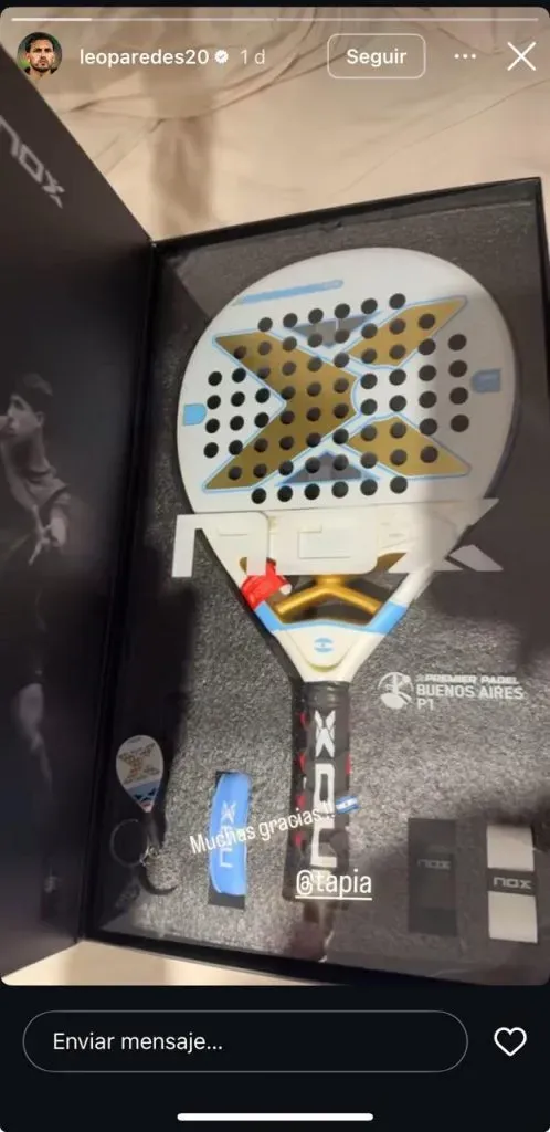 “Muchas gracias“, escribió Paredes mostrando una paleta obsequiada por el jugador de pádel Agustín Tapia. También argentino, el deportista acumula 48 títulos entre los circuitos de World Padel Tour y Premier Padel.