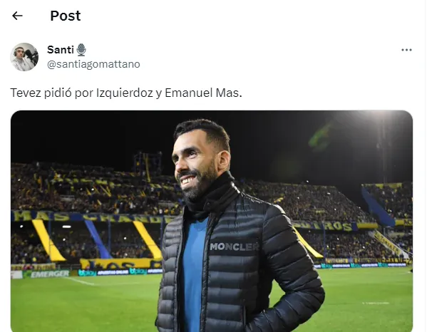 Una vez que tuvo la propuesta en sus manos, Tevez comenzó a pensar en nombres de confianza que lo acompañen y ayuden a acomodar un vestuario que pasa un complicado momento. Según contó el periodista Nicolás Brusco en ESPN, el Apache habría pedido tanto a Carlos Izquierdoz (Sporting Gijon) como a Emmanuel Mas. (Estudiantes de La Plata) Ambos exBoca.