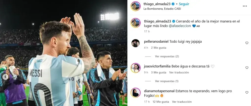 En noviembre de 2024, la Selección Argentina le ganó a Perú en La Bombonera y una publicación de Instagram de Thiago Almada luego del partido se volvió viral por la frase que utilizó. “Cerrando el año de la mejor manera en el lugar más lindo“, dijo el futbolista.