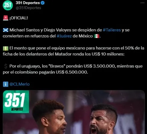 Dicho esto, y como se venía previniendo en las últimas horas, Valoyes finalmente cerró su salida de Talleres y su próximo destino será el Juárez de la Liga MX, club que pagará un total de US$ 6.500.000 por el 50% del pase del colombiano. A su vez Michel Santos, delantero también de Talleres, se marchará al mismo club por US$ 3.500.000 manteniendo el mismo porcentaje.