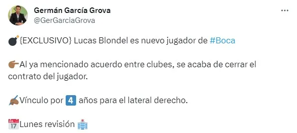 De acuerdo a lo que informó el periodista Germán García Grova, “Lucas Blondel es nuevo refuerzo de Boca”. Además, sumó que “al ya mencionado acuerdo entre clubes, se acaba de cerrar el contrato del jugador”, que será por cuatro años.