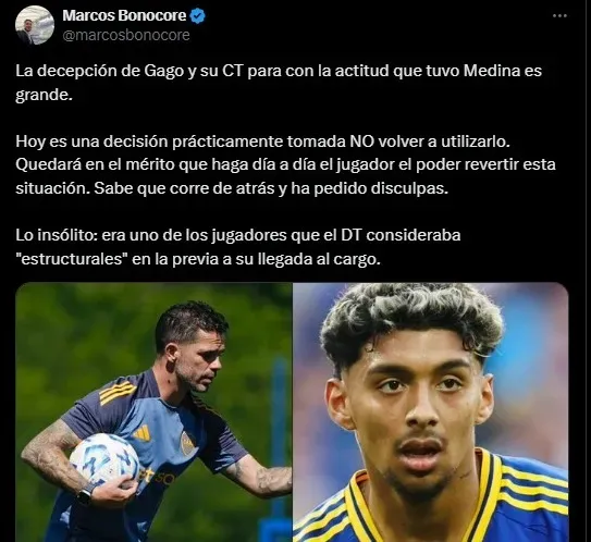 A su vez, el fuente remarcó: “La decepción de Gago y su CT para con la actitud que tuvo Medina es grande“. Y también, remarcó que el jugador era clave para el DT en la previa del conflicto: “Era uno de los jugadores que el DT consideraba “estructurales” en la previa a su llegada al cargo“.
