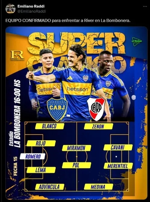 Según informó el periodista Emiliano Raddi para Planeta Boca Juniors, el Xeneize formará de la siguiente manera ante River: Sergio Romero; Luis Advíncula, Cristian Lema, Marcos Rojo, Lautaro Blanco; Cristian Medina, Pol Fernández, Kevin Zenón, Ignacio Miramón; Edinson Cavani y Miguel Merentiel.