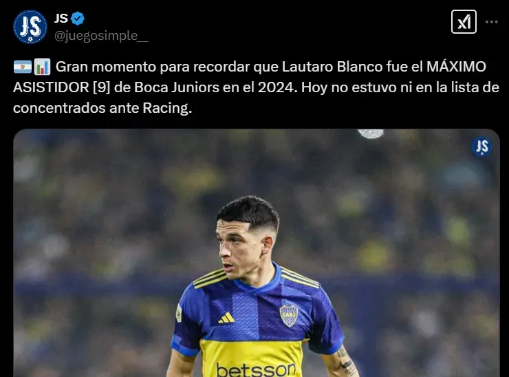 En lo que va del 2024, Lautaro Blanco no sumó ningún minuto con la camiseta de Boca. De esta manera, el lateral fue suplente ante Unión, Huracán y Argentino de Monte Maíz. Mientras que frente a Argentinos Juniors y Racing ni siquiera concentró.