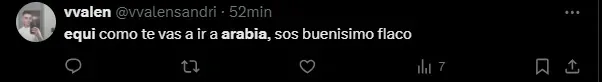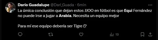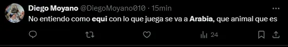 “No es serio que Equi se vaya a Arabia“, escribió un usuario en su cuenta de X (Twitter). “No podés irte a Arabia, Equi“, redactaron otros tantos hinchas en la red social, mientras que también sentenciaron: “Qué jugador es Equi Fernández. No puedo dimensionar que se vaya a Arabia“.