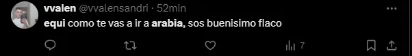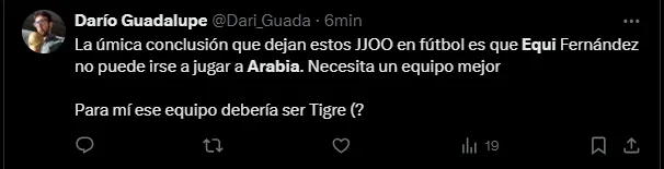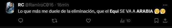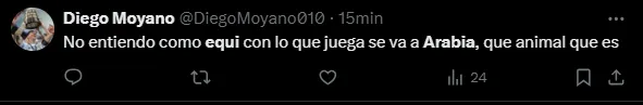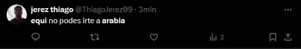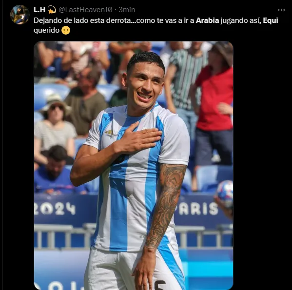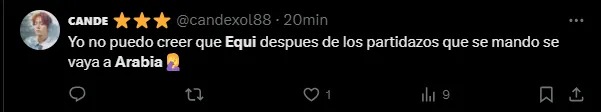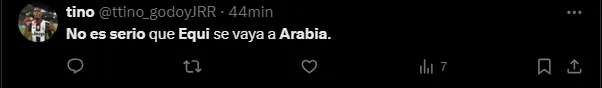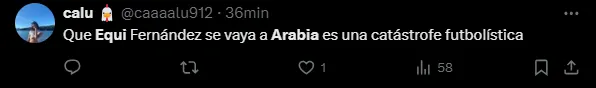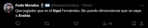 “No es serio que Equi se vaya a Arabia“, escribió un usuario en su cuenta de X (Twitter). “No podés irte a Arabia, Equi“, redactaron otros tantos hinchas en la red social, mientras que también sentenciaron: “Qué jugador es Equi Fernández. No puedo dimensionar que se vaya a Arabia“.