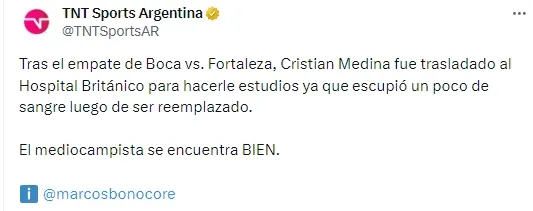 Su salida en el carrito antes de que finalizara el partido ya encendía las alarmas y tiempo después se confirmó su presencia en el Hospital Británico. El periodista Marcos Bonocore dio más información sobre este hecho e informó que el traslado se dio “para hacerle estudios, ya que escupió un poco de sangre luego de ser reemplazado”. Además, la fuente citada mencionó que “el mediocampista se encuentra bien”.