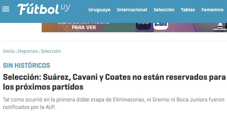 Según indicó el sitio Montevideo, “ni Gremio ni Boca fueron notificados por la AUF (Asociación Uruguaya de Fútbol)”. No serían las únicas bajas en el combinado charrúa, quien se encuentra en el tercer lugar de la tabla con tres unidades. Otra de los históricos que se perdería los próximos duelos sería Sebastián Coates.