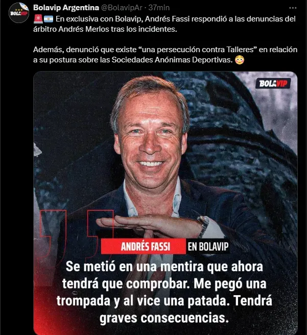 A través de una entrevista exclusiva con Bolavip, Fassi le respondió a Merlos y no se guardó nada al referirse sobre el cuerpo arbitral: “No tienen vergüenza. Merlos se metió en una mentira que ahora tendrá que comprobar”. Luego, reconoció que comenzaron acciones legales contra el árbitro y cree que existe una “persecución contra Talleres” por su postura con las Sociedades Anónimas Deportivas.