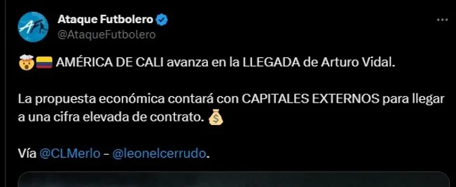 En este panorama aparece el América de Cali, club colombiano que está más cerca de cerrar la llegada de Vidal. En este caso, la información fue revelada en su momento por César Luis Merlo y pudo informarse que el equipo rojo escarlata contará con la ayuda de capitales extranjeros para poder pagar su contrato.