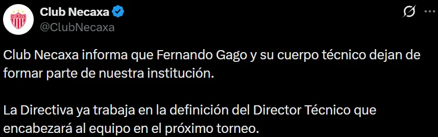 Luego de su salida de Boca, Gago rápidamente asumió como entrenador en el Necaxa de México. Sin embargo, a poco más de un mes de terminar el 2025, “Los Rayos” decidieron interrumpir el contrato de “Pintita” hace unas semanas. Ahora, a través de sus redes oficiales, hicieron público el final de su ciclo.
