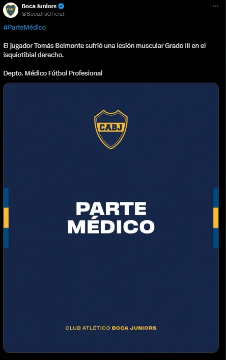 Luego del entrenamiento de Boca de este jueves, Tomás Belmonte había dejado la cancha con molestias. Ahora, el club publicó finalmente qué tiene y está claro que no podrá ser parte de los concentrados que enfrentarán a Racing este sábado en La Bombonera.