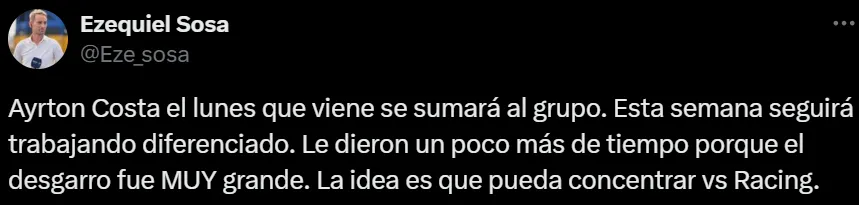 Pero, ¿por qué no se incorpora esta semana?, el cronista marcó que la idea de Boca es llevarlo con cautela, debido a la gravedad de la lesión. Por lo que no pretenden apurarlo y el cuerpo técnico lo quiere al 100%. De esta manera, si no sucede ningún inconveniente, Costa estará a la par del grupo a partir de este lunes, y se espera que concentre para el partido ante Racing el próximo domingo.