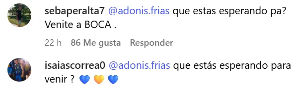 Adonis dejó su mensaje en la última publicación de La Bestia, y los fanáticos no pasaron por alto esto. En ese sentido, varios pidieron que venga al club. “Venite a Boca”, “¿Qué estás esperando? venite a Boca” y “Super necesario, tiene que venir ya”, fueron algunas de las respuestas que tuvo el comentario tanto en Instagram como en X (Twitter).