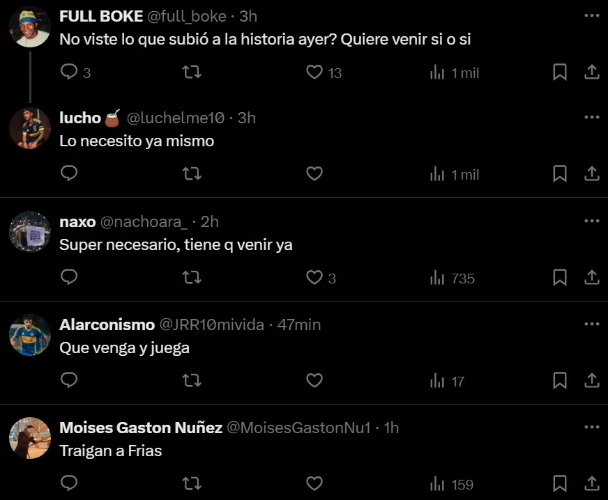Ahora, el zaguero volvió a mostrar su fanatismo por el conjunto de la Ribera y generó revuelo entre los hinchas. Frías comentó una foto de Miguel Merentiel elogiándolo por su actuación ante Benfica. “La Bestia no falla”, escribió seguido de dos corazones azul y amarillo. Los fanáticos no lo dejaron pasar y pidieron su llegada al club.